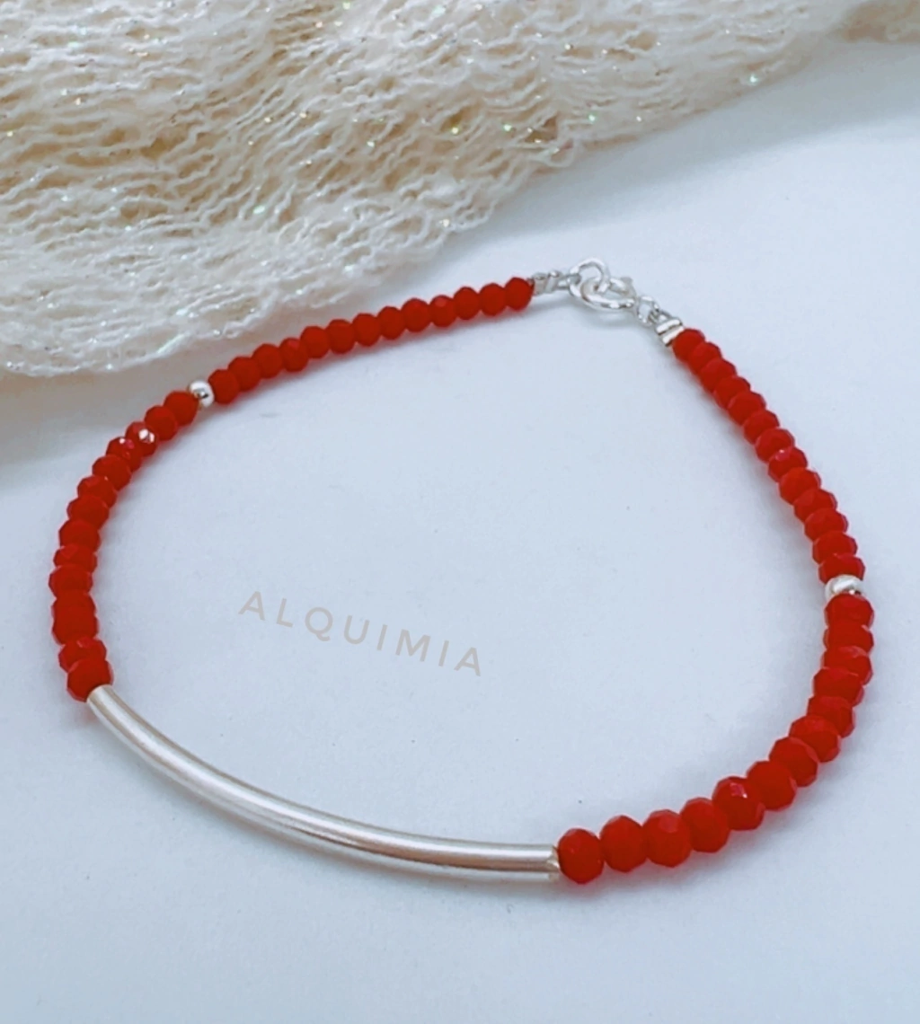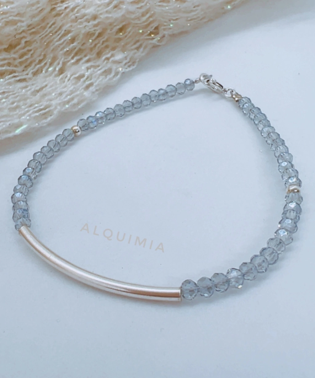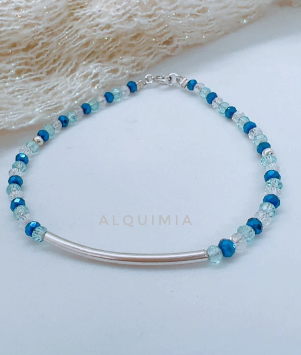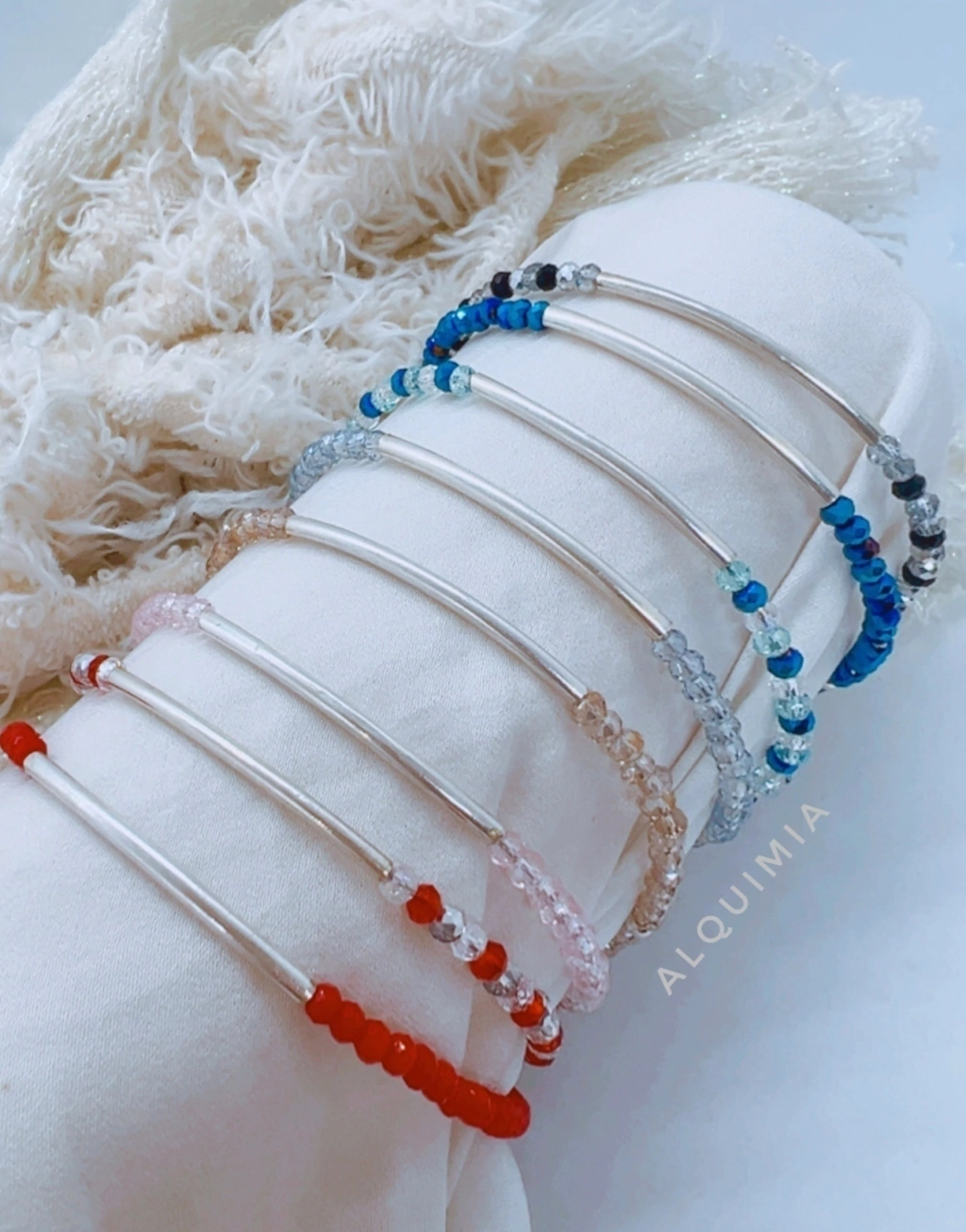 PULSERA CRISTAL CON TUBITO + 1 bolita lateral ( VARIOS COLORES)- 19 cm - PLATA 925 - P.002