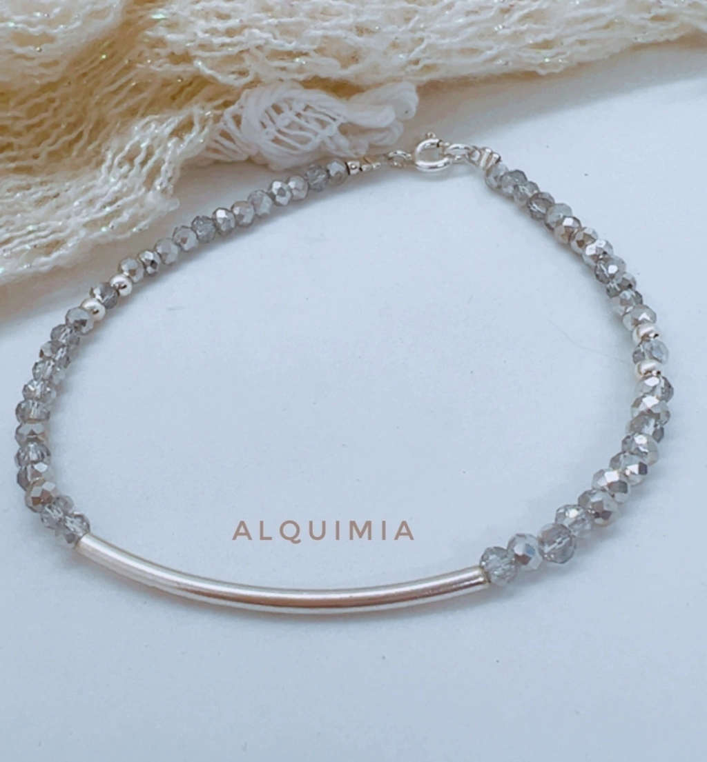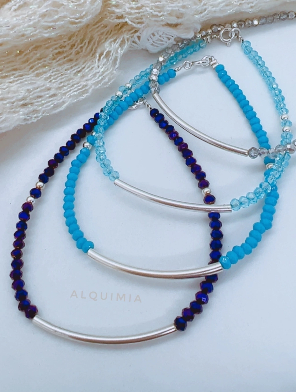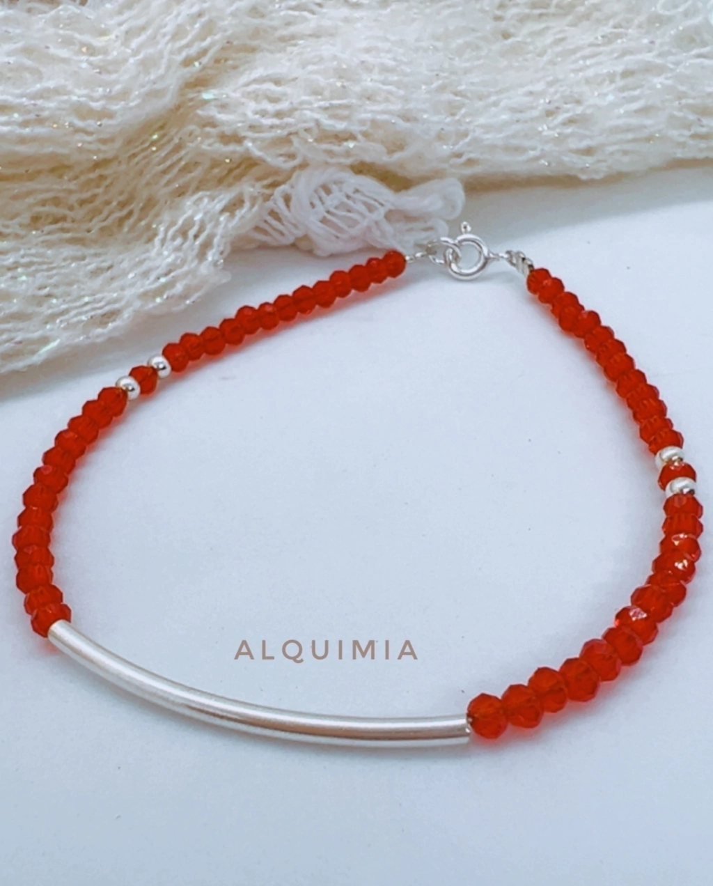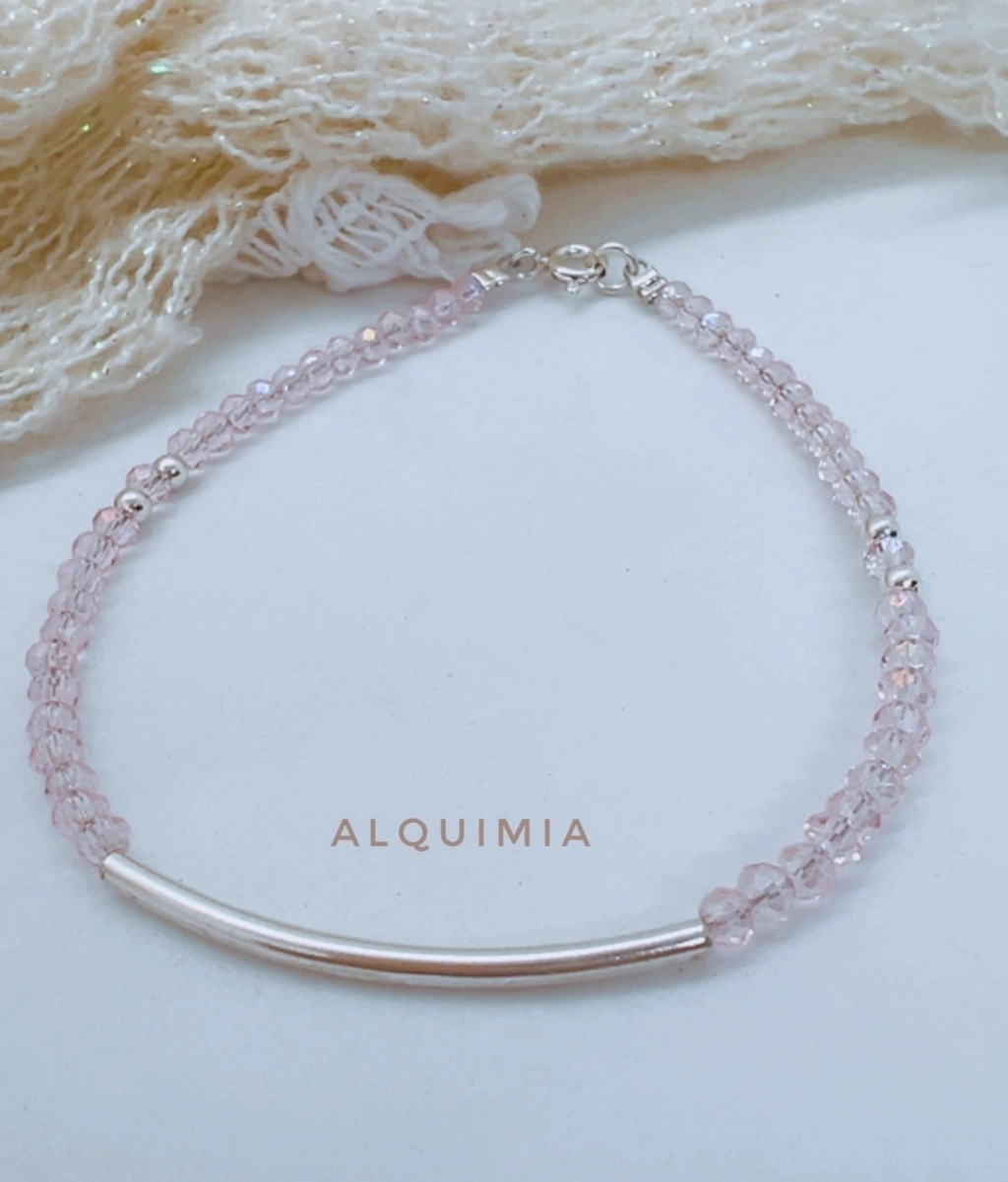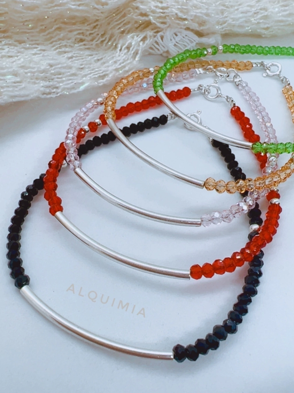 PULSERA CRISTAL CON TUBITO + 2 bolitas laterales - VARIOS COLORES- 19 cm - PLATA 925 - P.004/2